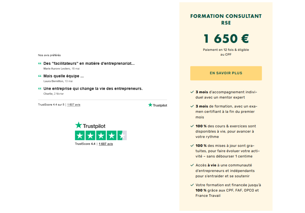 - Formation reconnue et bien évaluée : note de 4,6/5 sur Trustpilot.